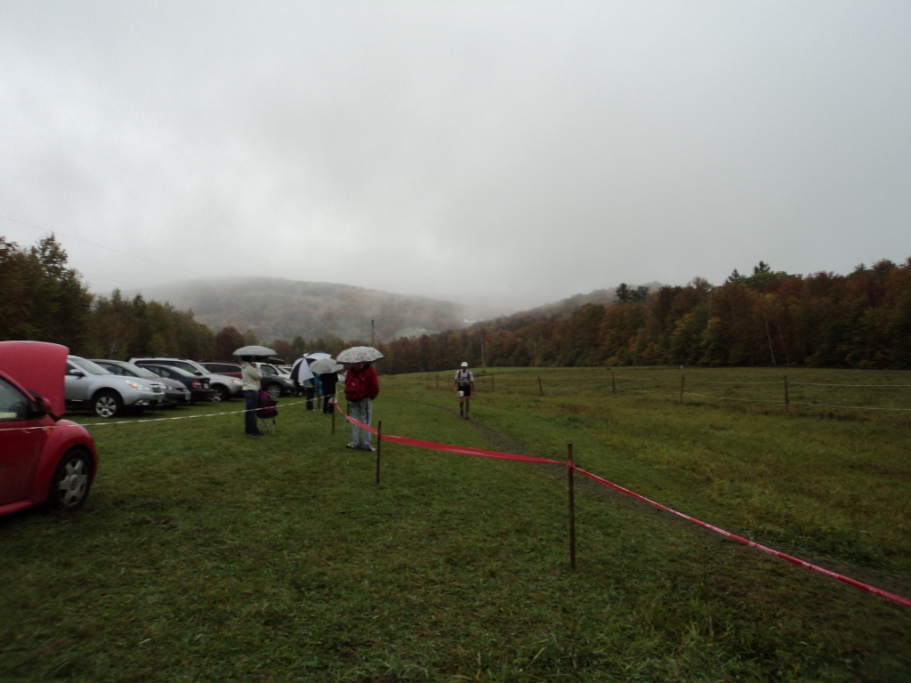 Mais juste comme je m’approche, une madame débarque d’une auto et une bénévole se dirige vers elle, nous annonçant: « Mesdames et messieurs, la fondatrice de la Vermont Adaptive Ski and Sports » (c’est l’organisme qui bénéficiera des profits de la course). Tout le monde est distrait, comme si c’était le pape qui se présentait. Heu, excusez, c’est que j’ai une course à faire, genre… Et puis, laissez faire. Je me charge moi-même de remplir mes bouteilles d’eau, mange un peu et quitte le mini-attroupement autour de la pseudo-papemobile.