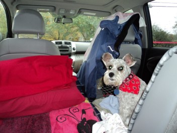En ouvrant la porte, je découvre Charlotte, bien évachée sur un siège arrière. Elle me regarde ayant l’air de dire: « T’es ben niaiseux de courir dehors par un temps pareil ! » Elle ne se lève même pas pour venir me voir. Constatez par vous-mêmes de quoi ça a l’air, un chien maltraité…