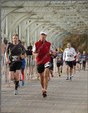 Mais ho, qui vois-je devant ?  Mais c’est ma paire de jambes du début de course, ma parole !  Il n’y a plus que le gars du début qui l’accompagne, la fille n’y est plus. Ha, toujours aussi agréable pour la vue, malgré les heures passées sur la route… Puis, pervers-pépère se transforme. Le compétiteur en moi ressort quand je songe à une phrase que j’ai lue à quelque part et qui m’a marquée. C’était un “vieux” comme moi qui avait lancé à un jeune (son fils peut-être) avant un marathon: “Sur 10 km ou même un demi, je ne peux pas aller à ta vitesse. Mais au 20e mille, your ass is mine. [Je n’ai pas pu trouver une traduction qui punchait autant que l’originale]”. Et voilà les jeunes, le vieux renard vous botte maintenant le derrière (en tout cas, il botte au moins un des deux…) !  🙂