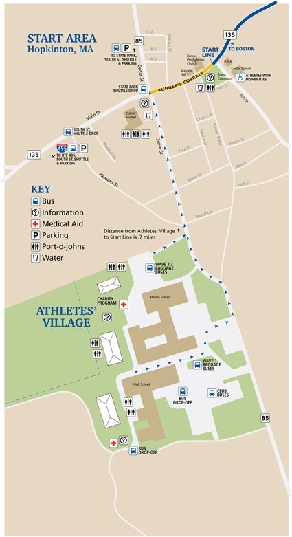 Le Village des athètes est installé sur les terrains de ce qui semble être une école secondaire. C’est gigantesque. On y retrouve bien évidemment des toilettes (duh !), je n’en ai jamais vu autant de toute ma vie. Ottawa ?  Mississauga ?  Pffff !  C’est absolument rien à côté de ça.  Il y a aussi plusieurs tentes abritant les commanditaires qui distribuent ce dont tout athlète pourrait avoir besoin en attendant le départ: Power bar, café, eau, Gatorade, muffins, bagels, bananes. Avoir su, je n’aurais pas amené mon lunch… Il y a aussi de la musique, un animateur qui dirige les coureurs en rappelant certaines consignes et un écran géant.