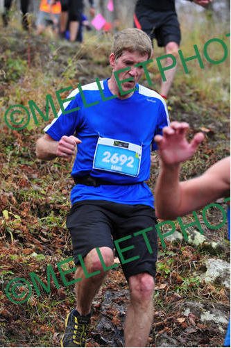 Je ne sais pas si Sylvain a couru dans les traces laissées par les VTT durant les 3 premiers kilomètres. Il passait son temps à courir dans l’herbe longue pour dépasser des gens. Moi, je suivais sans broncher, Daniel également. Nous étions définitivement mal placés dans le peloton au départ. Par contre, les dépassements se faisaient bien, les sentiers étant suffisamment larges.