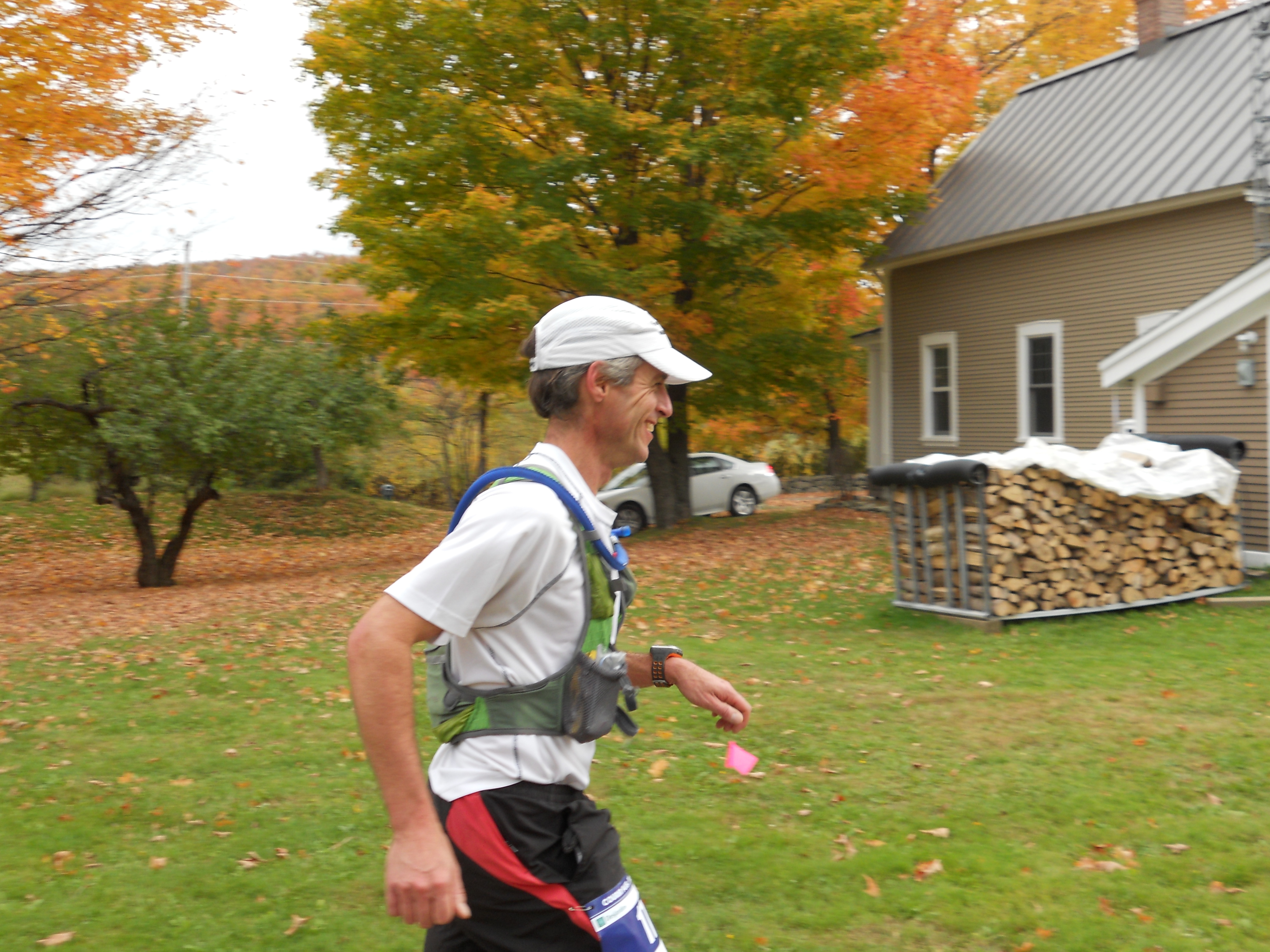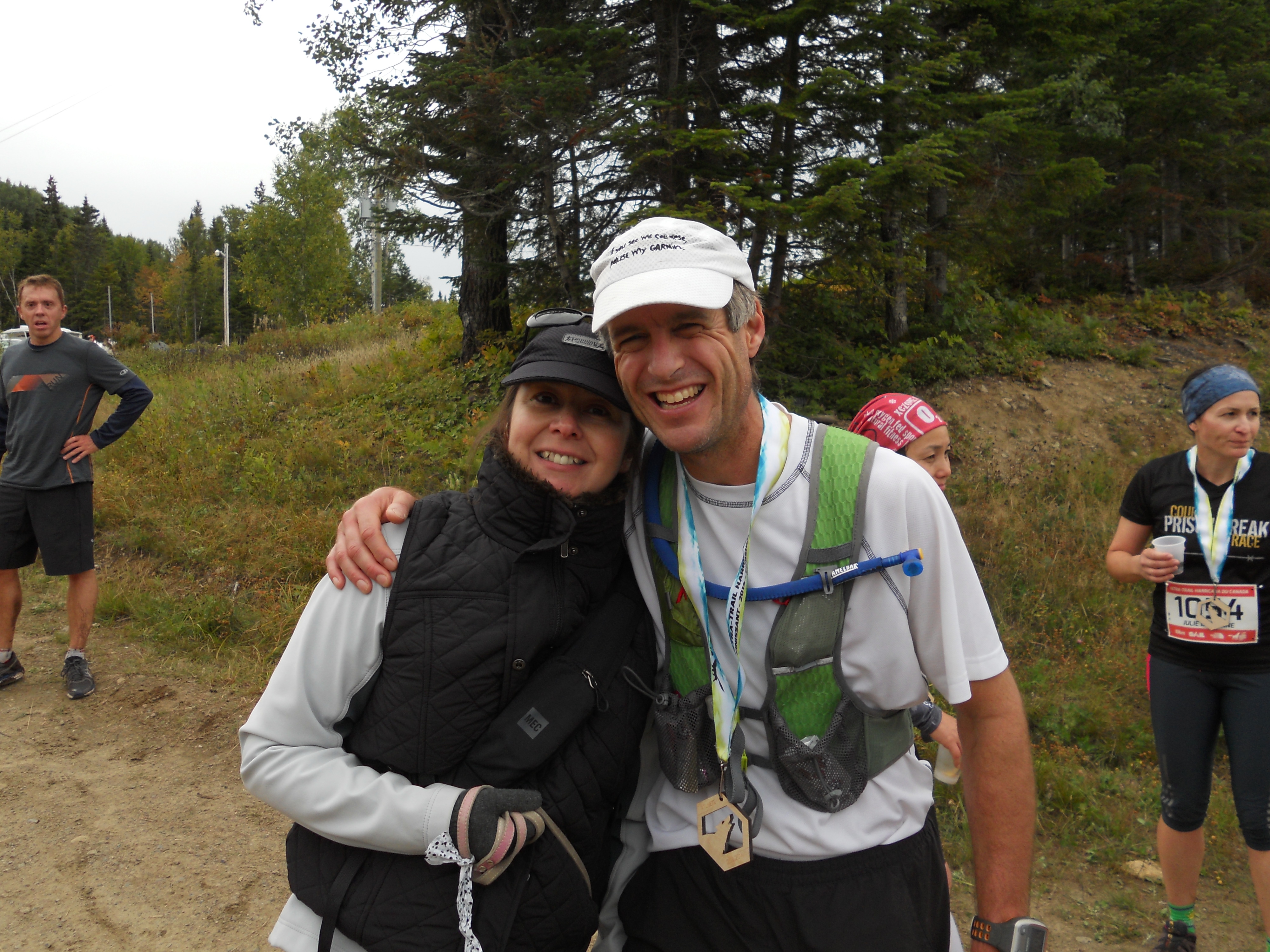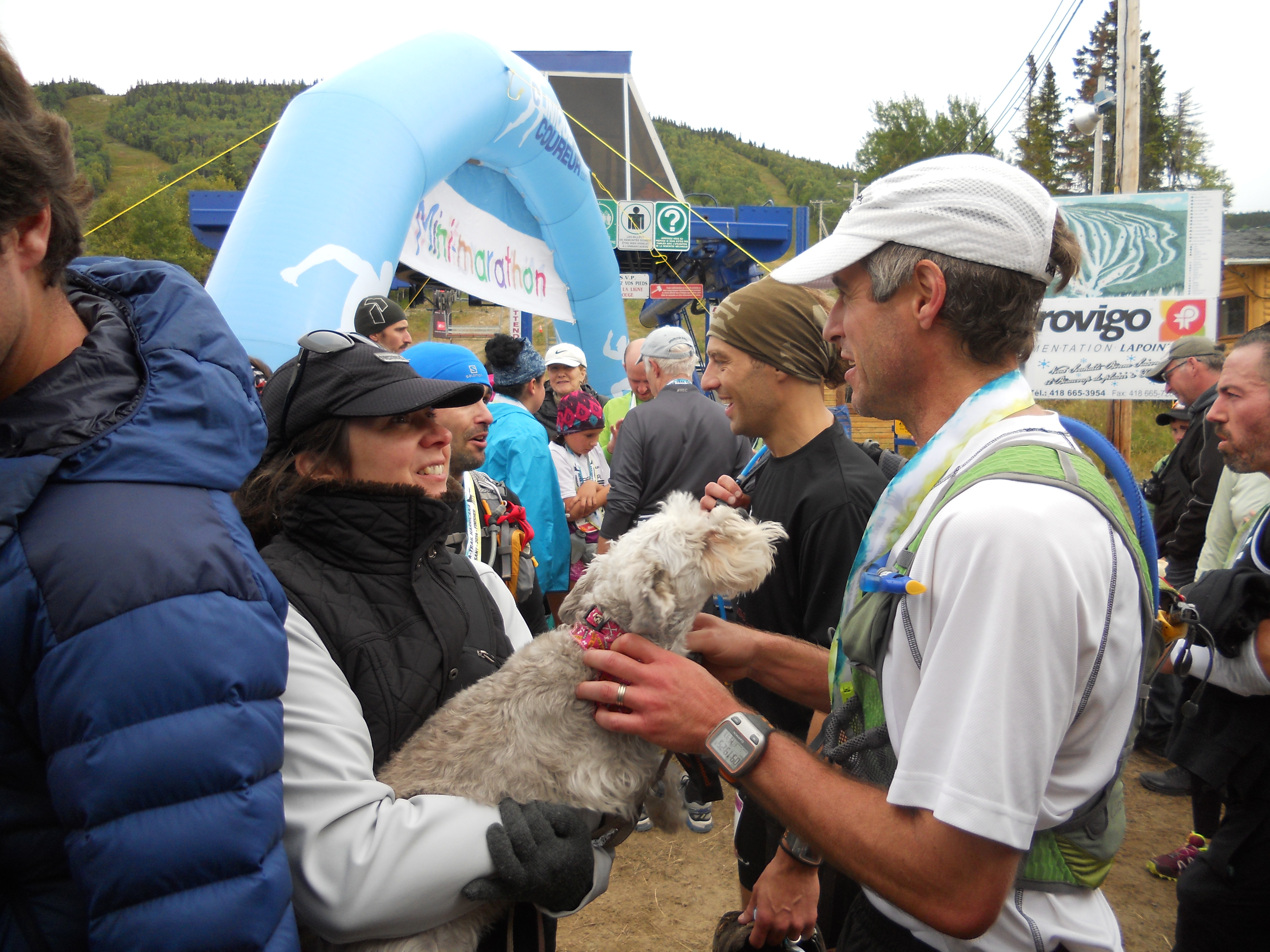 « Fred ? Qu’est-ce que tu fais derrière moi ? ». Je me demande plutôt ce que tu fais devant moi, chose ! Aussitôt, je lui demande s’il a fait les sentiers du lac Gale. « C’est quoi ça ? ». Tu n’as pas vu le lac ? Le sentier sur le bord, la vue d’en haut… « Non. ». Ha ben bout de viarge, il n’a pas fait la boucle du lac Gale ! J’ai au moins 15 kilomètres de plus que lui de parcourus ! Je lui demande s’il a un GPS, question de vérifier la distance parcourue. Négatif. Évidemment. Cout’ donc, qui est-ce qui court sans GPS de nos jours ? En tout cas, j’en suis à peu près certain: les indications n’étaient pas assez claires au camp de base et il est parti sur la droite au lieu de prendre la gauche. Moi, je connais un peu la géographie du coin, mais ce n,est pas pareil pour tout le monde.