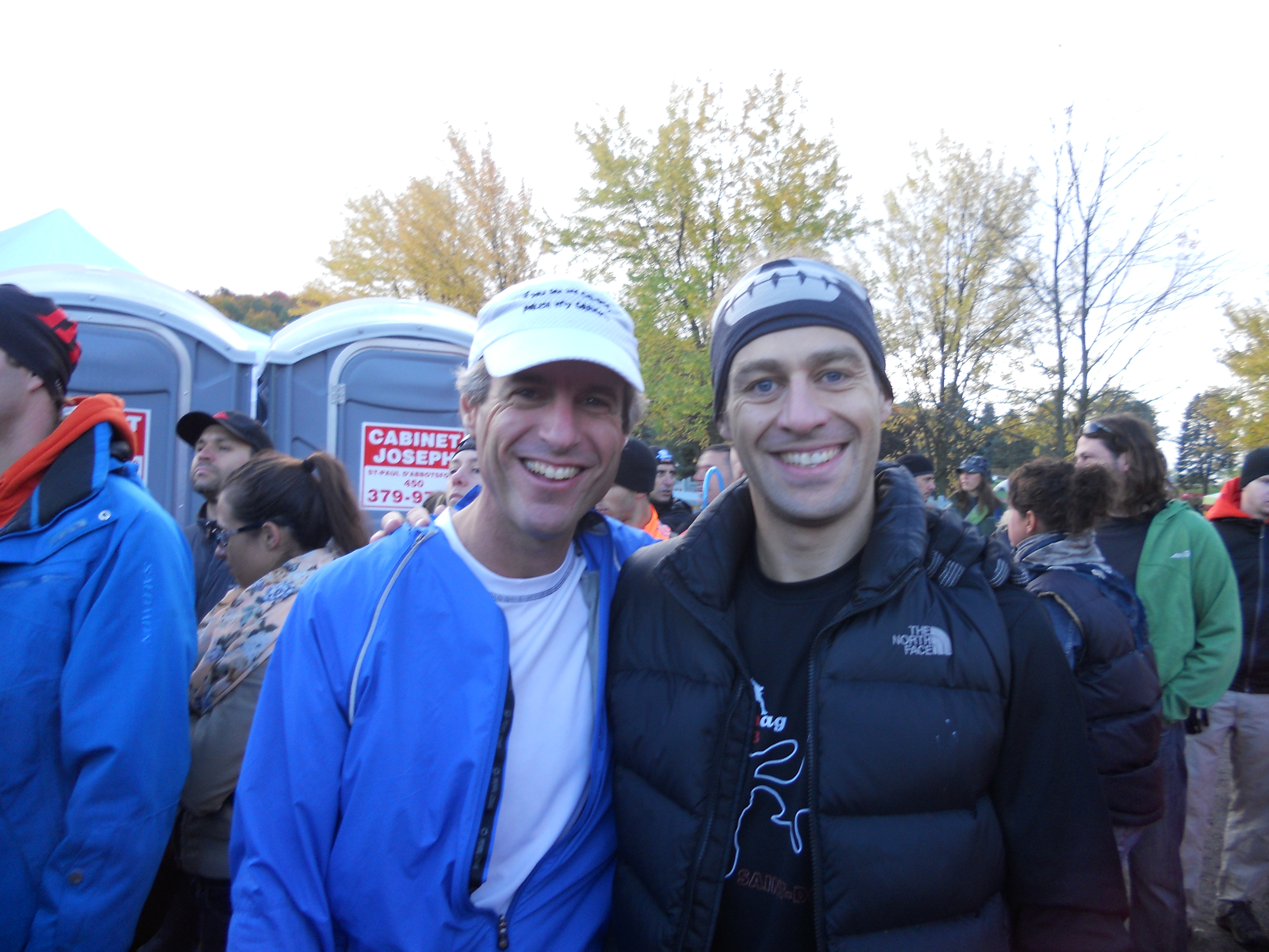 Je reconnais ensuite ma gang qui m’attend avec un bel enthousiasme. Parmi eux, un intrus : Pat, qui porte des vêtements chauds et une tuque. Ha non, il a dû abandonner… Shit ! Mon expression doit trahir ce que je pense, car il s’empresse de me dire, sur un ton très calme : « C’est pas grave. C’est vraiment pas grave. On va se reprendre !» Je lis la sérénité dans ses yeux, ce qui me rassure un peu. Il n’a pas l’air blessé, probablement qu’il a encore son exploit de l’UTMB dans le corps. Je suis quand même déçu pour lui. C’est un peu beaucoup grâce à lui si je suis ici aujourd’hui… Il nous raconte ce qui s’est passé ici. Oui, on va se reprendre Pat.