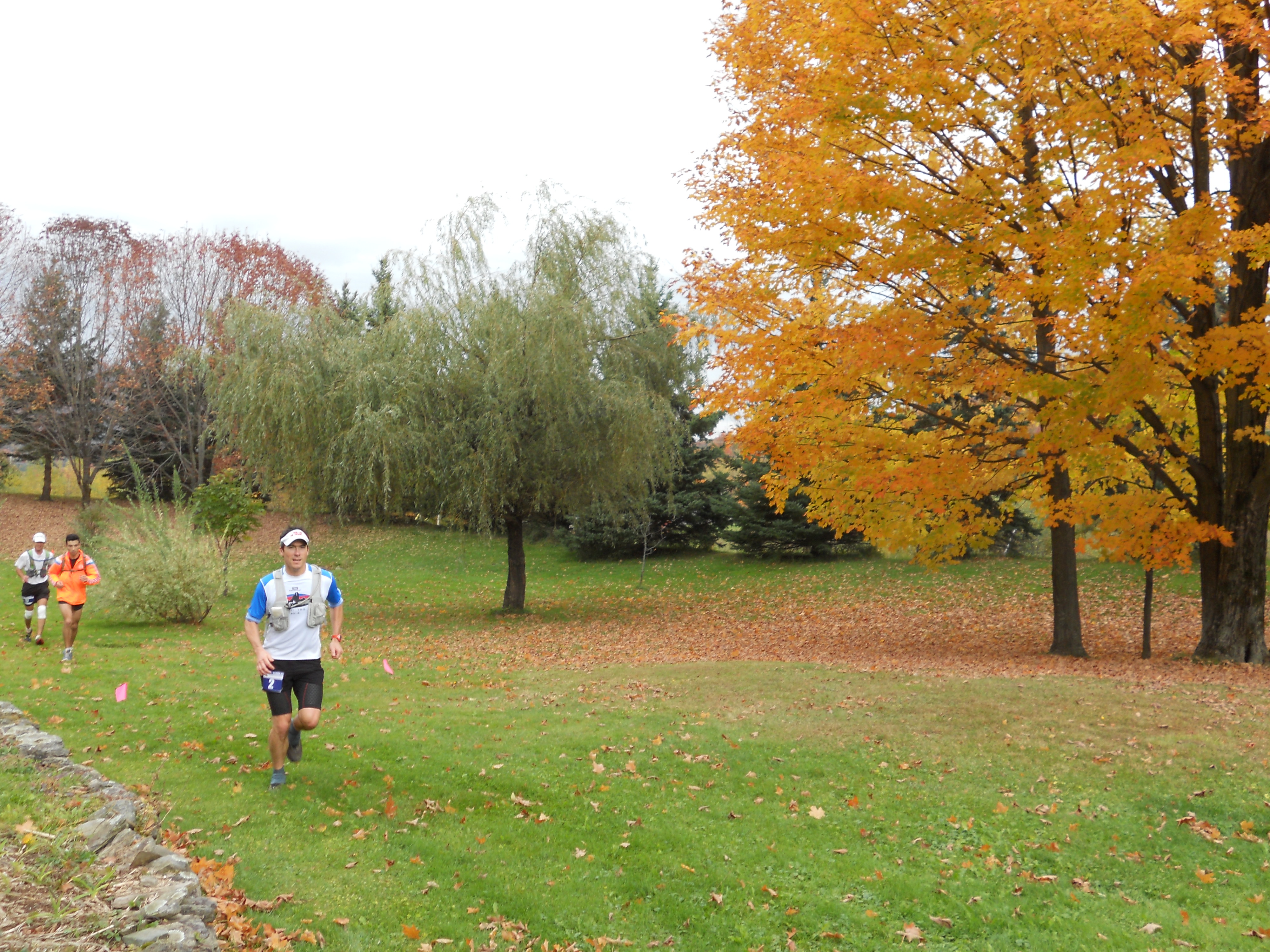 C’est au joyeux son des gueling-gueling de ma cloche que j’attaque le petit bout très roulant dans le champ menant aux sentiers. Je ne peux pas croire que je vais endurer ça toute la nuit… Je pénètre ensuite dans les sentiers du mont Oak, les premiers que j’ai faits à la course lors d’un séjour en camping dans la région il y a quelques années. Dans la forêt, l’obscurité se fait vite sentir et je vis une première : courir à la lueur de la frontale.