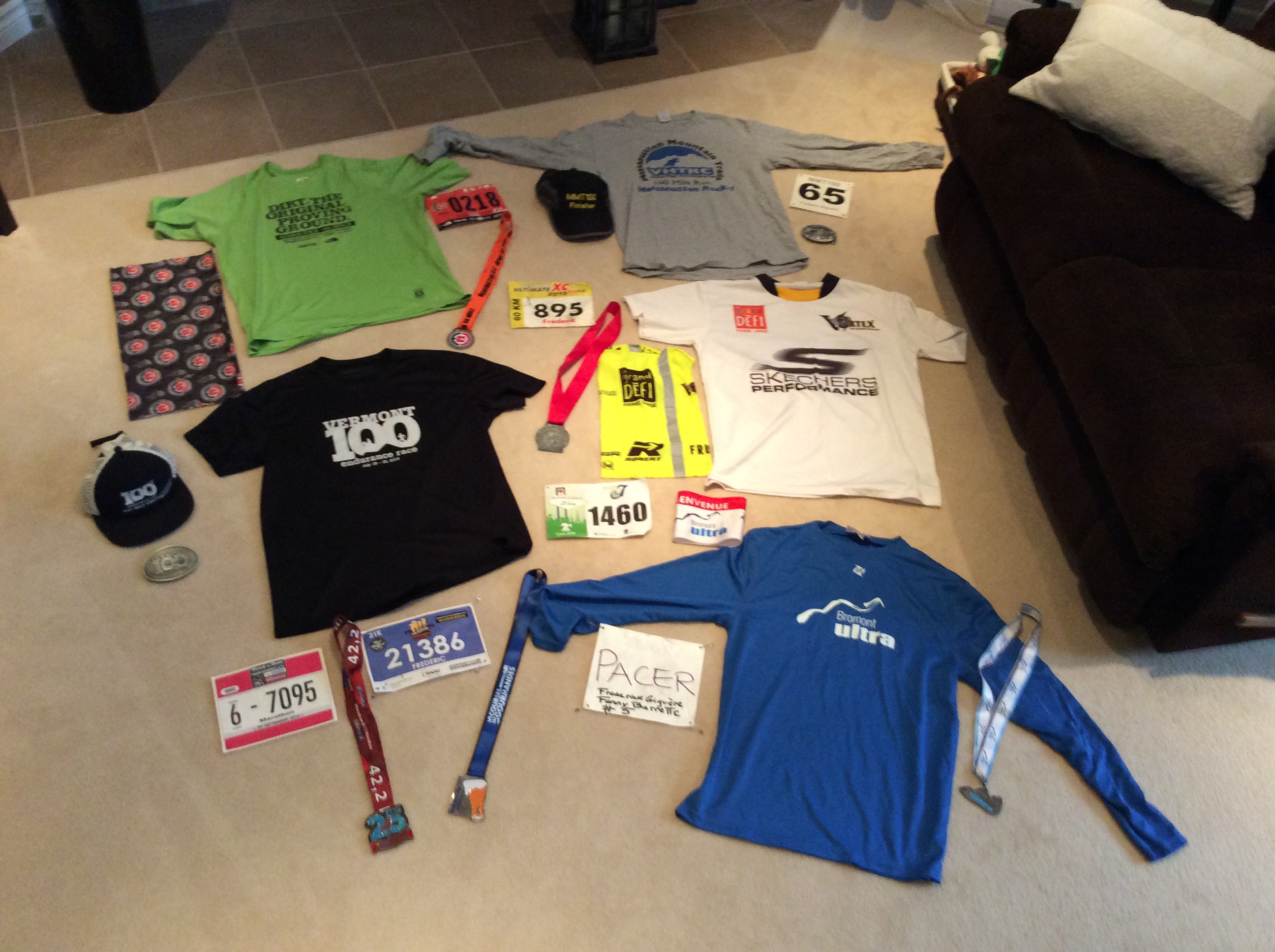 Les « souvenirs » de l’année 2015. Absents de la photo: le dossard du Vermont 100 que je ne retrouve plus et le t-shirt du Marathon de Montréal qui a servi pour ma course de ce matin et qui ne pouvait pas être présent 😉