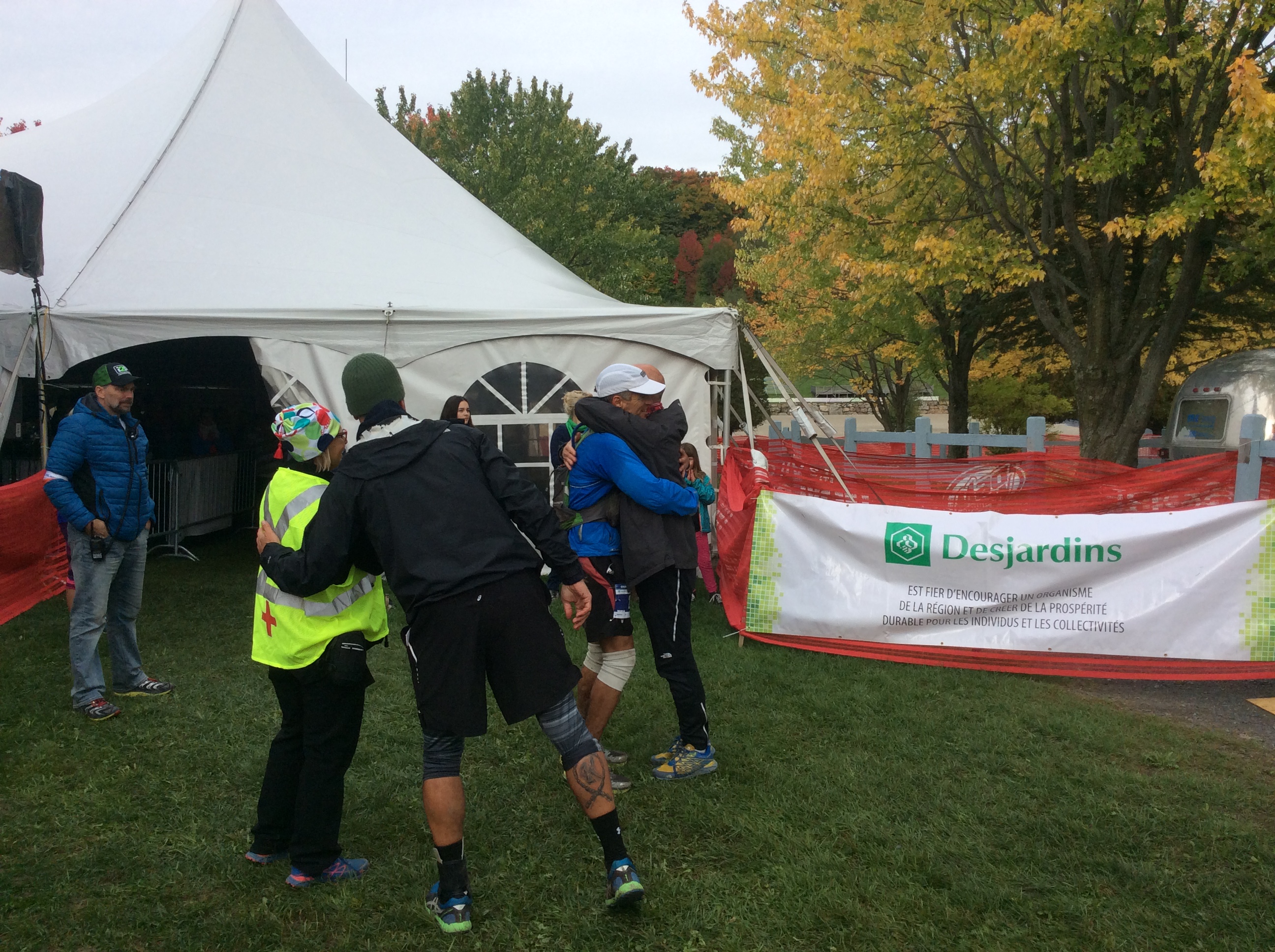 Mon papa m’aide à remplir une dernière fois le réservoir de ma veste puis, tout en faisant nos petits 200-300 mètres ensemble en quittant le ravito, je lui demande si ça lui tenterait qu’on finisse ensemble. « Hein, la dernière boucle ?!? ». Non, juste la fin, 200-300 mètres justement. J’ai vu le monde faire ça l’an passé et je trouvais ça cool. Je m’étais entre autres joint à la famille de Fanny et sa pacer de la dernière boucle pour faire le dernier bout. C’est comme une façon de dire que cette course-là, c’est un travail d’équipe. « Je vais y penser ».