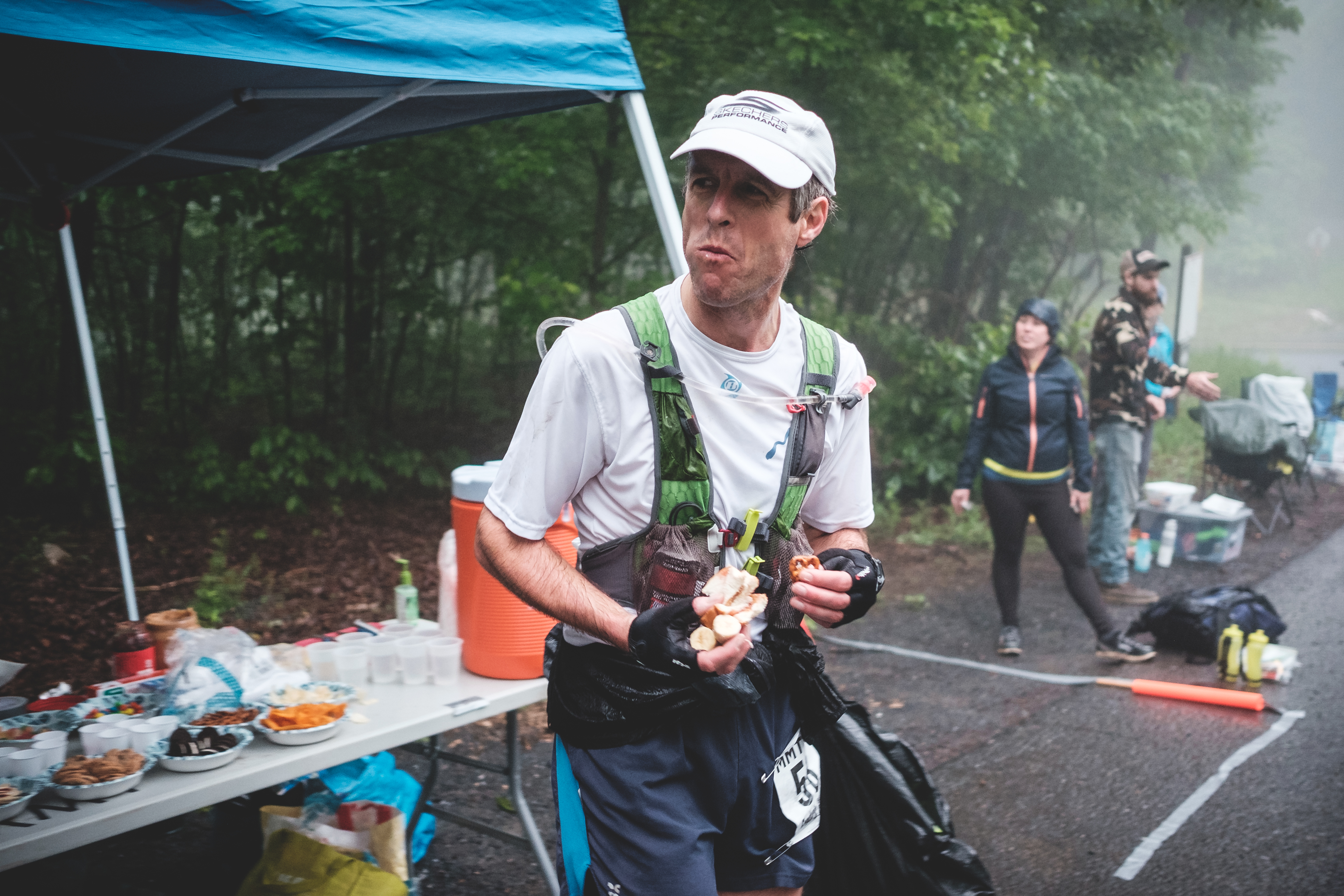 Toujours est-il que rendu au ravito, je me suis fait un petit ménage. Mes pieds étaient détrempés et sales, mais ne présentaient aucun problème majeur. On nettoie ça, on essuie bien comme il faut, puis on enfile des bas propres. J’ai toutefois décidé de garder mes Peregrine, même s’ils étaient mouillés: je ne faisais tout simplement pas confiance aux Skechers dans de telles conditions.
