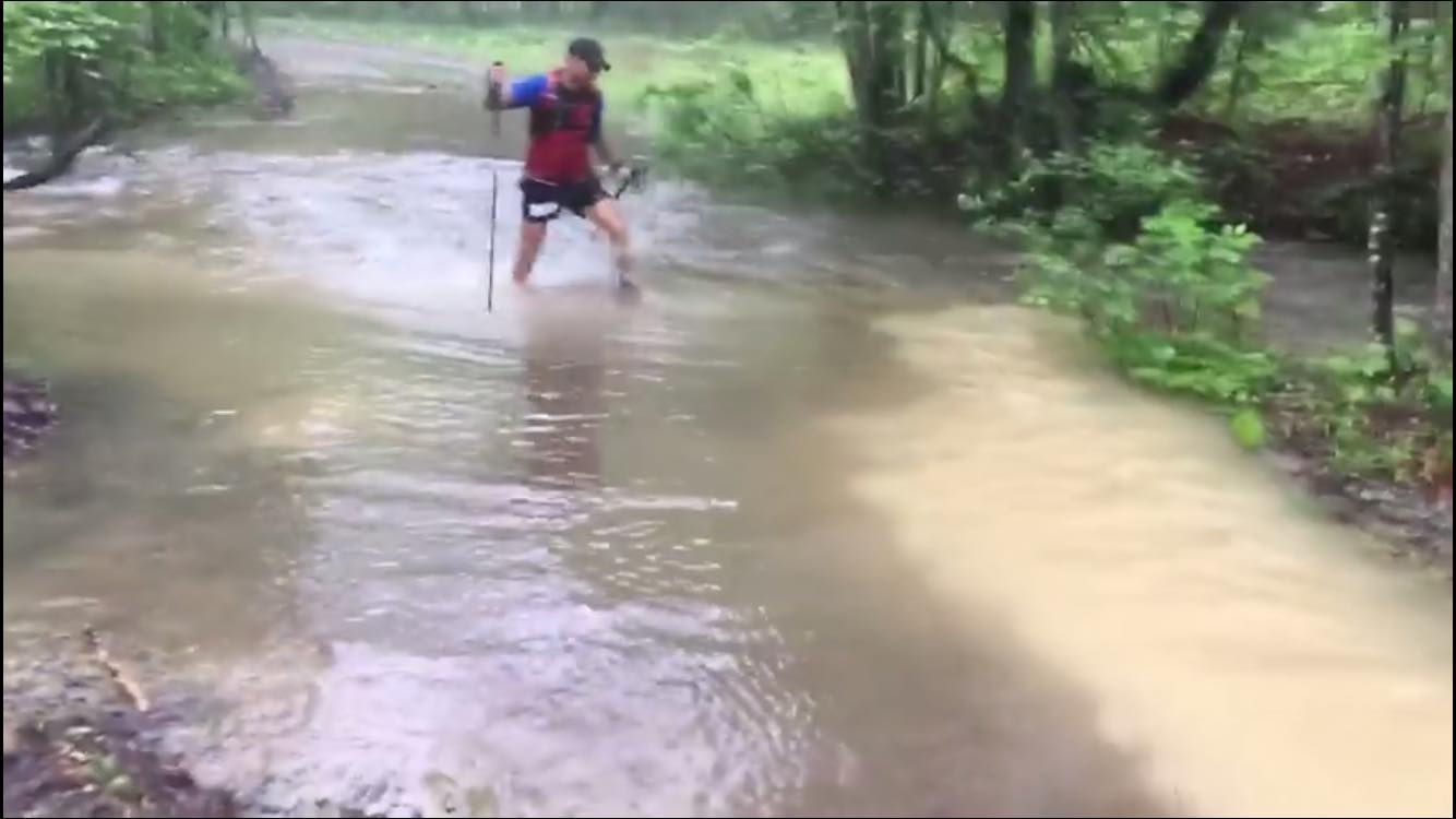Sur les crêtes, c’était mouillé, mais sans plus. Mais quand on descendait, hou la la… En fait, je n’ai pas pris beaucoup de temps avant de déterminer un certain pattern: quand le sentier se transformait en ruisseau, ça signifiait que la station d’aide approchait. Mon raisonnement était simple: les ravitos à Massanutten sont établis dans des creux. Et comme l’eau descend, ben…
