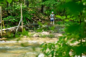 Dernière descente dans un sentier, Pas commode après 103 miles. J’entends le ruisseau en bas. Je sors du bois. « Fred ! C’est Fred !!! ». Ce sont Guy et Éric qui m’attendent.