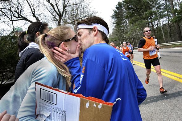 Je suis à peine arrivé au début du « tunnel » que j’aperçois une jeune asiatique qui tient une pancarte sur laquelle est écrit: « Kiss me, I want my PR ! ». Bon ben, pas le choix, si la demoiselle vise un record personnel, faut que je me dévoue… Je me penche donc pour qu’on échange un baiser simultané sur la joue, mais la petite me surprend en m’enlignant drette sur le kisser, comme on dit (Always on my Mind, Always on my Mind, Always on my Mind…). Ouais, elle va l’avoir, son record personnel à ce rythme-là ! 🙂 J’aurais protesté, mais que voulez-vous, pas le temps, j’ai un marathon à courir moi.. 😉